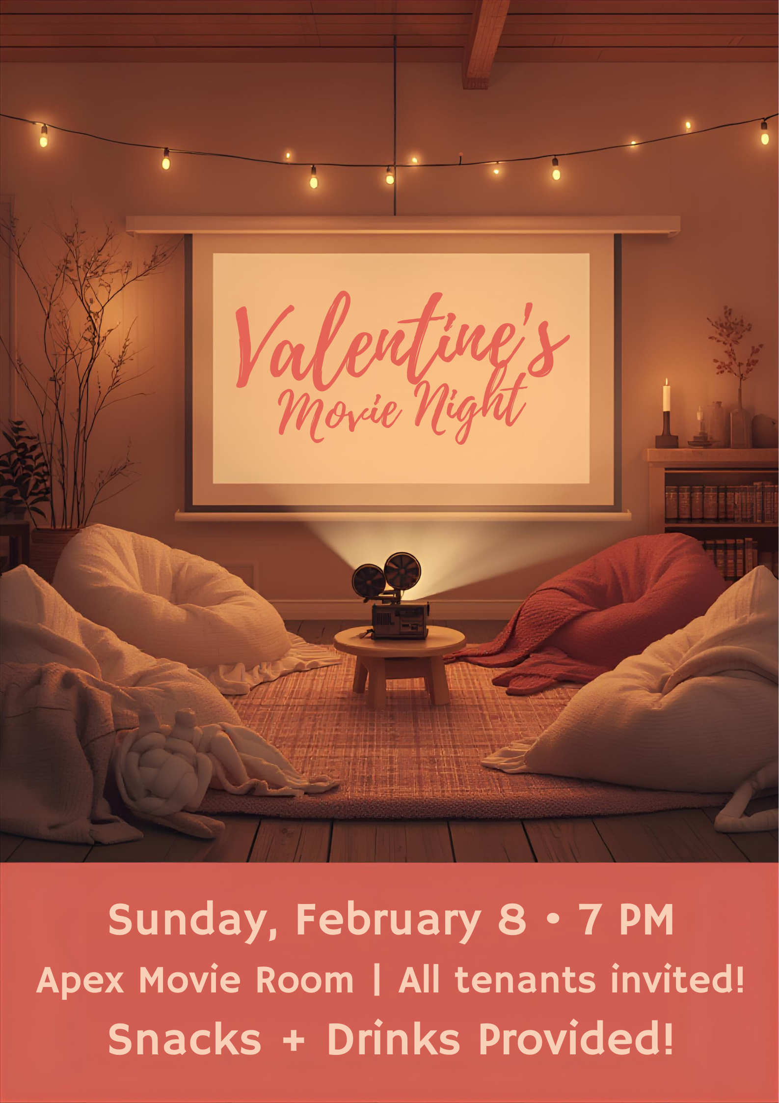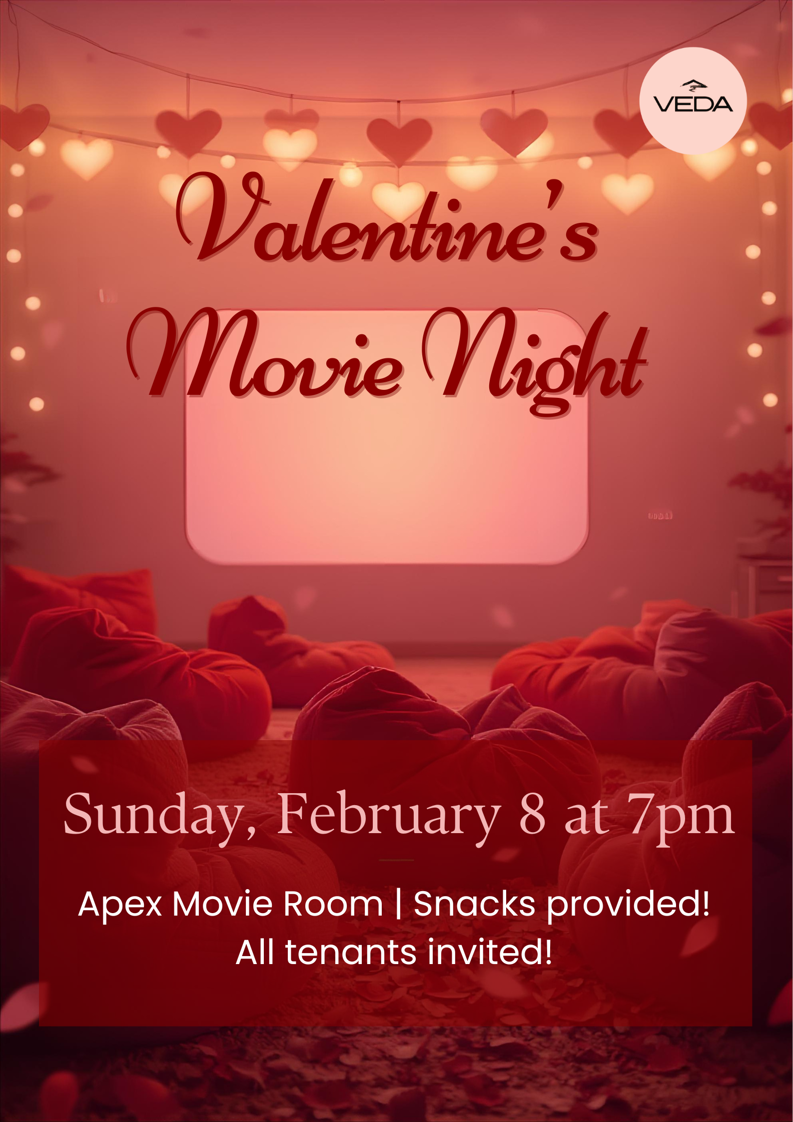 Valentine’s Movie Night + Add to Google Calendar + iCal / Outlook export 00 days 00 hours 00 minutes 00 seconds Date Feb 08 2026 Time 7:00 pm - 9:00 pm Location APEX Club Room Category Apex & Sunset Ridge Lakeview & The Pines Organizer Your VEDA Tenant Ambassador's Share this event