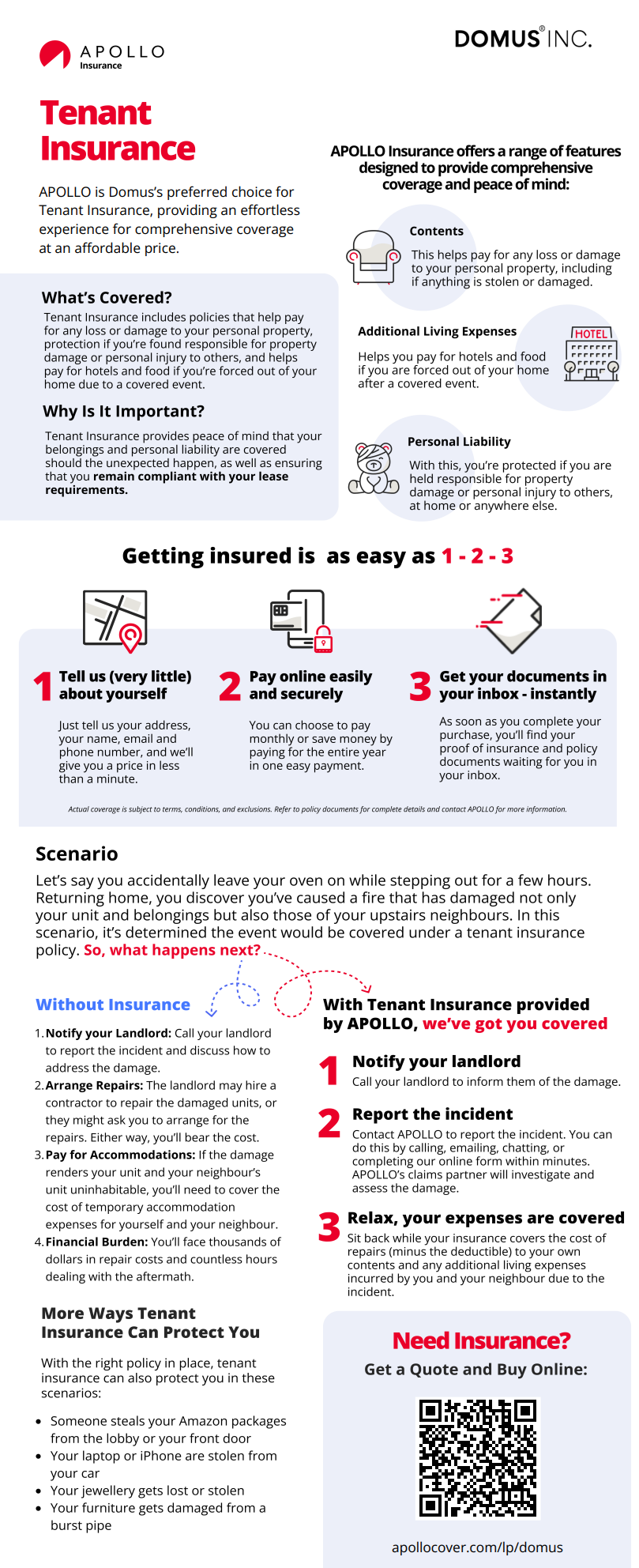 If you need to purchase tenant insurance, or are looking to switch and save money, Domus has partnered with APOLLO Insurance, our preferred insurance provider. As a Domus resident, you’ll receive:
